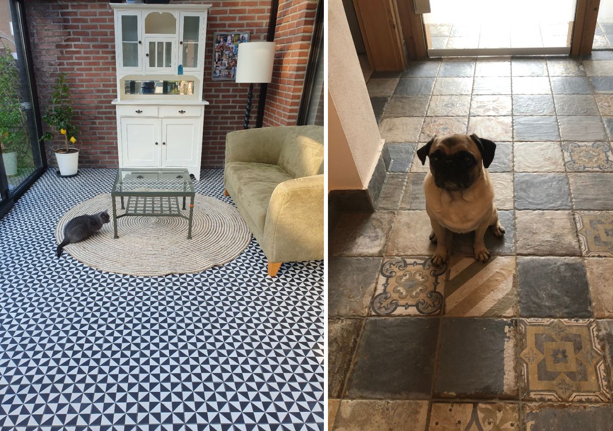 Besonders leicht lassen sich auf Fliesen umherfliegende Haare von Katzen entfernen. Links: Britisch Kurzhaar-Katze auf Tap 8, rechts: Mops auf Havana.