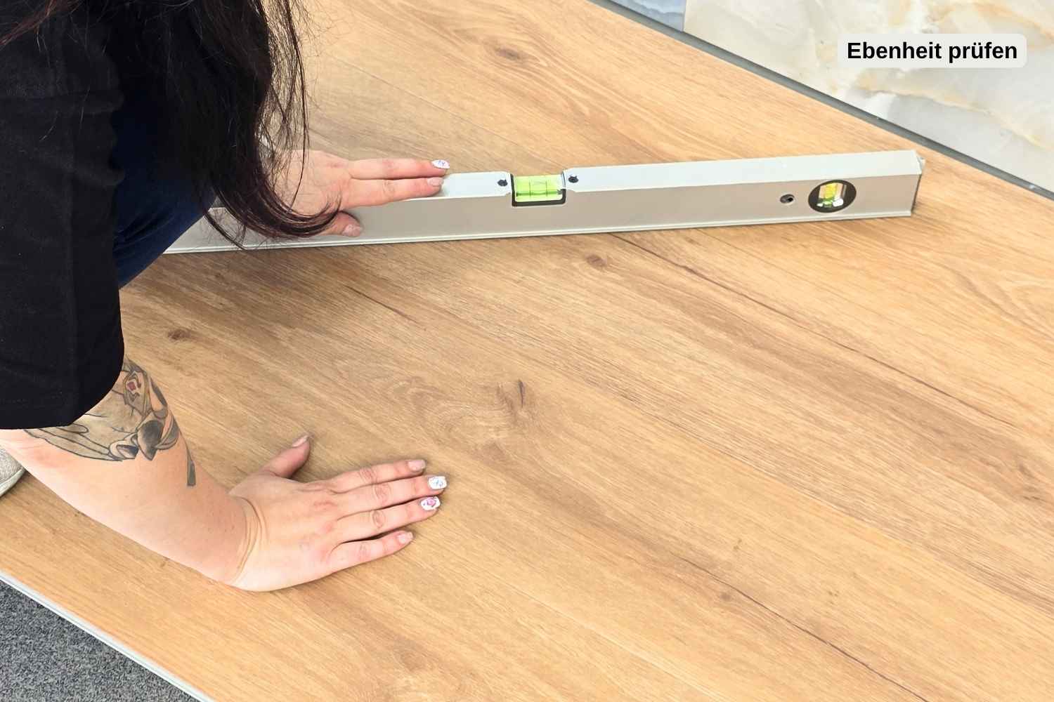 - Ebenheit prüfen: Der Boden sollte möglichst eben sein, da Unebenheiten später zu unschönen Druckstellen führen können. Gegebenenfalls muss eine Ausgleichsmasse verwendet werden.