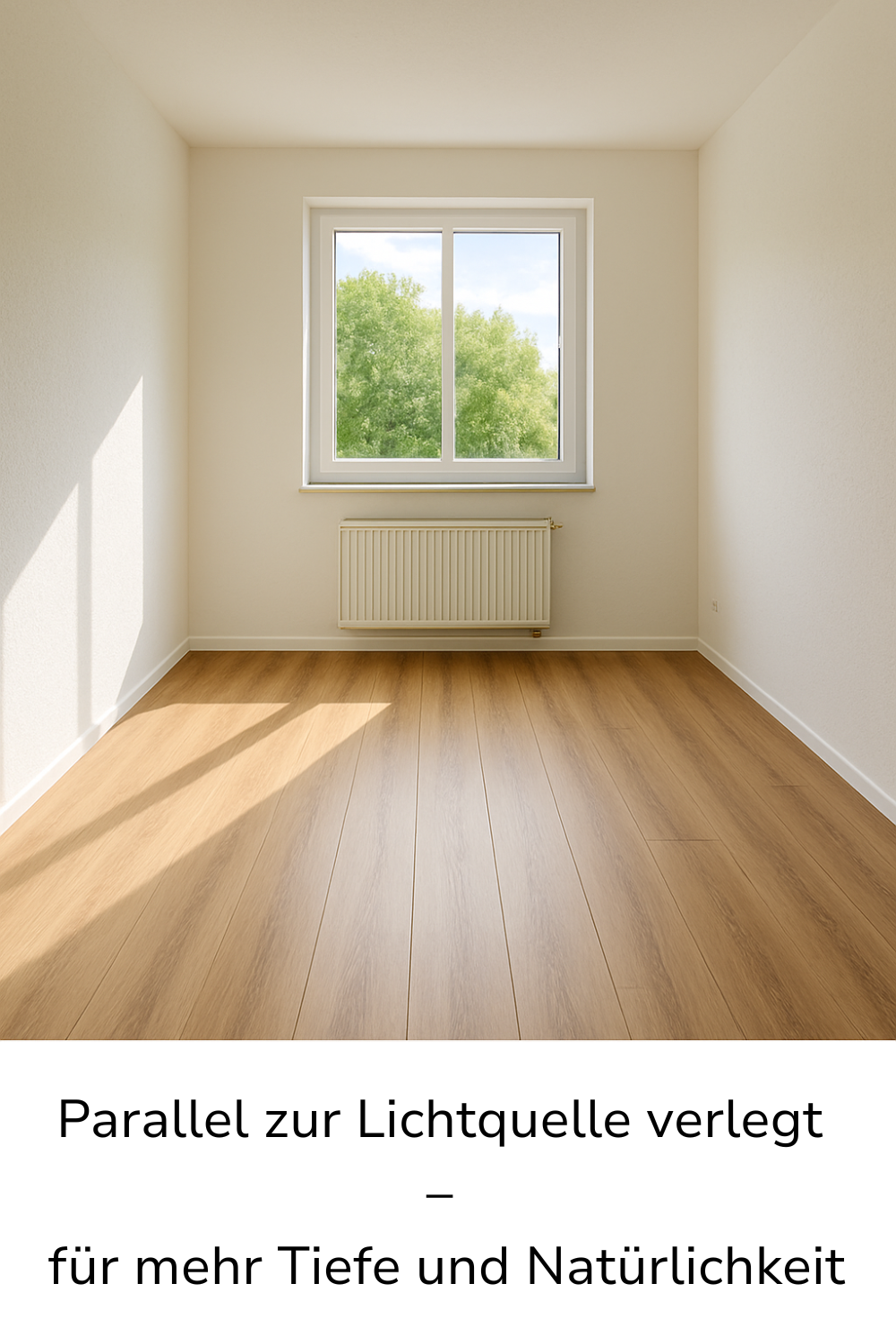- Lichtrichtung: Vinyl-Bodenbeläge sollten immer parallel zur Hauptlichtquelle (Fenster) verlegt werden. Dadurch entsteht eine optische Tiefenwirkung.