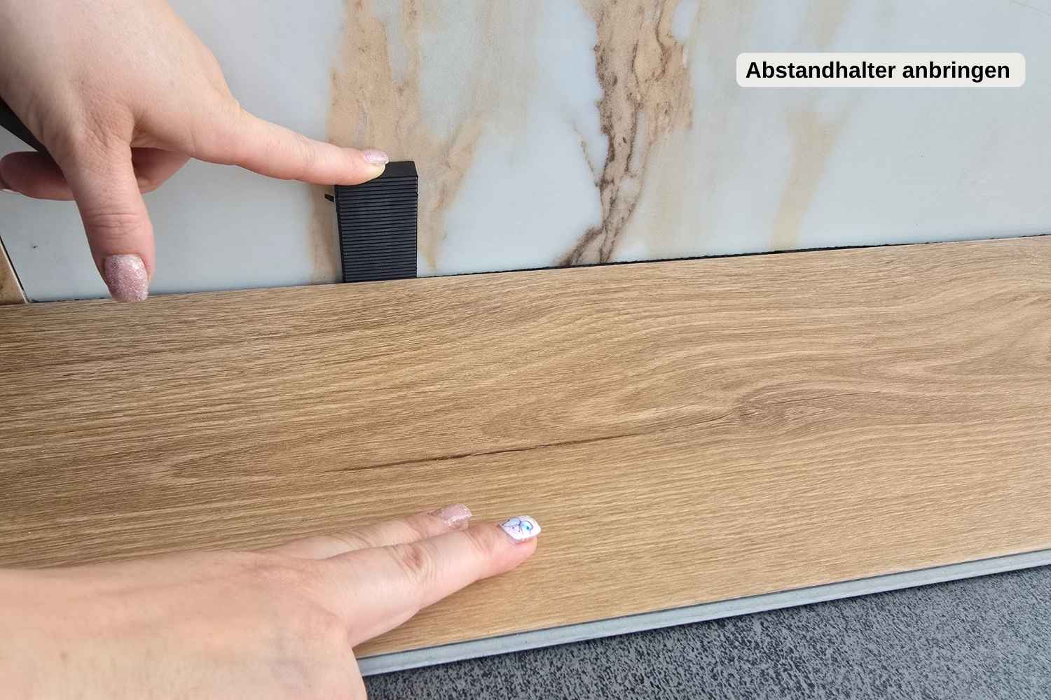 - Die erste Reihe entlang der Wand ausrichten mit Abstandshaltern verlegen.