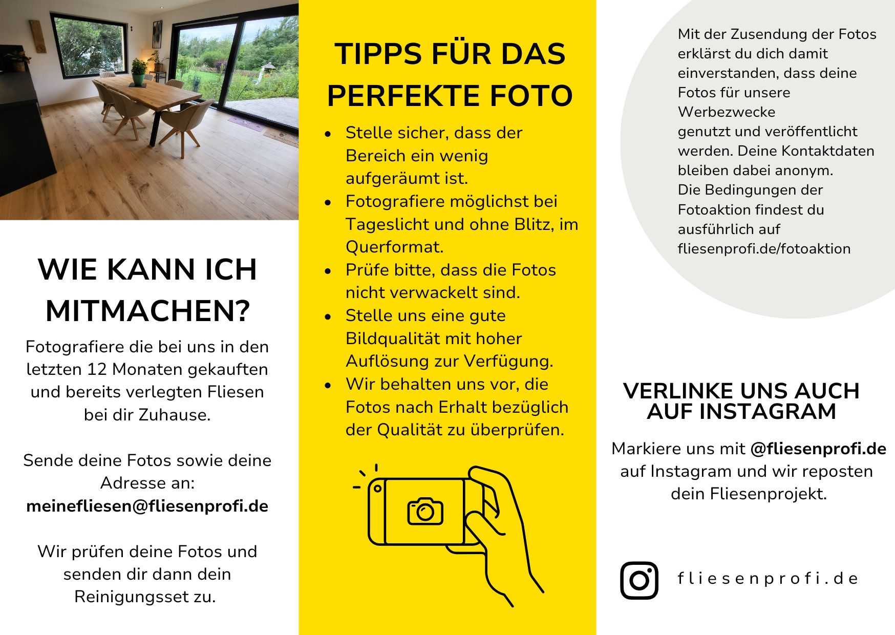 Fotografiere die bei uns gekauften und bereits verlegten Fliesen bei dir Zuhause und sende uns deine Fotos und deine Adresse per Mail an: meinefliesen@fliesenprofi.de