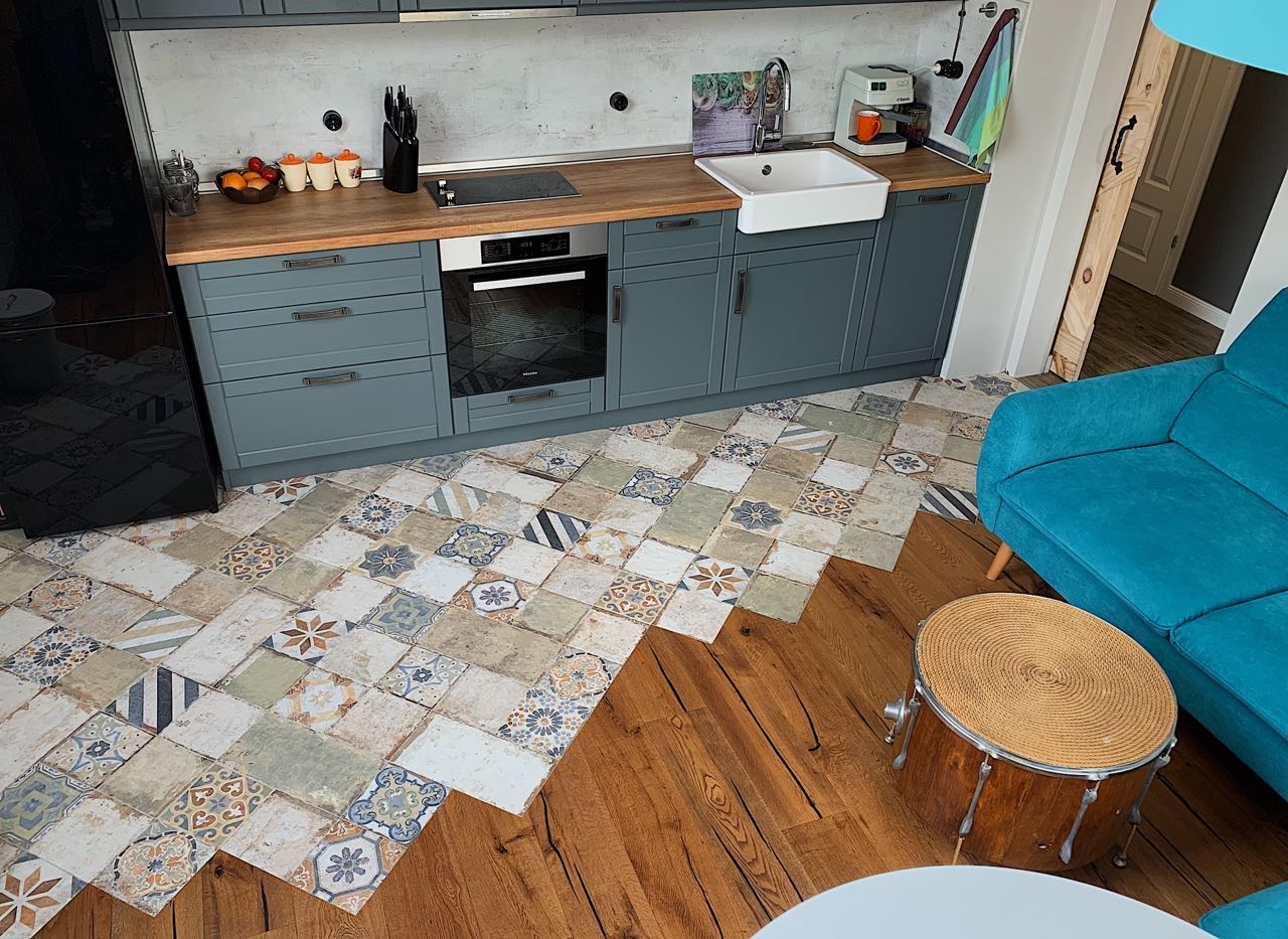 Fliesenboden und Holzboden im harmonischen Wechsel